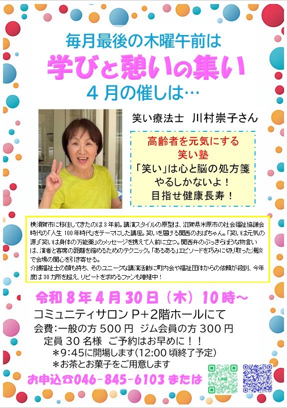 4月の学びと憩いの集いのテーマは「笑いは心と脳の処方箋」をお送りします!